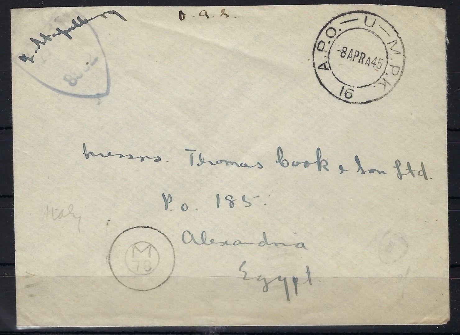 Feldpost eines Angehörigen der Afrikanischen Truppen an der Seite der Alliierten, im Einsatz in Nordafrika gegen die Wehrmacht. Feldpostbrief befördert nach Alexandria (Ägypten) 1945