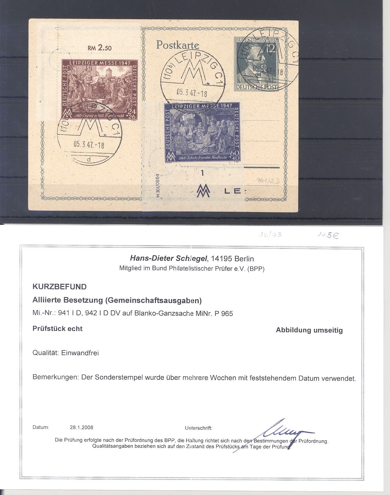 Alliierte Besetzung Michel Nummer 941/942 I D, die Messeausgaben 1947 in der besseren Type auf Blankokarte, die Michel Nummer 942 hat zudem einen Druckvermerk. Es liegt ein Kurzbefund BBP, ist mit eingescannt, der Michel für lose gestempelt beträgt bereits 430.00 Eutro.
