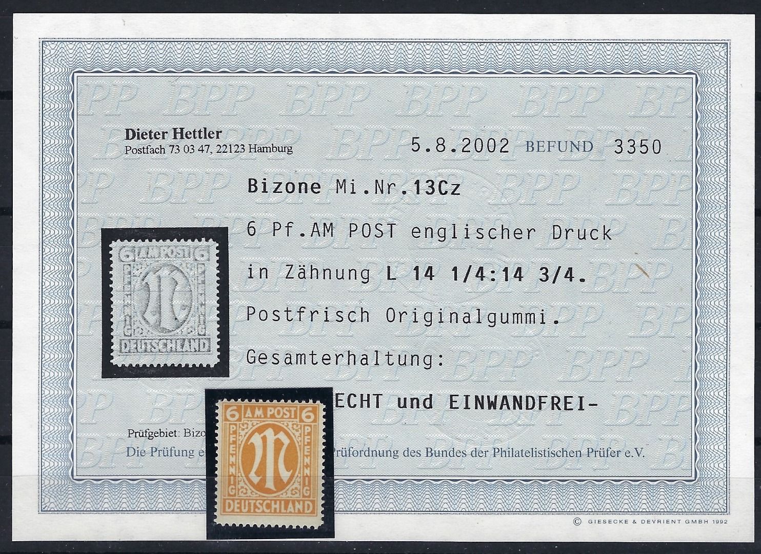 AM Post Mi 13 C z in der Zähnung 14 1/4 : 14 3/4 postfrisch und einwandfrei mit Befund Hettler BPP