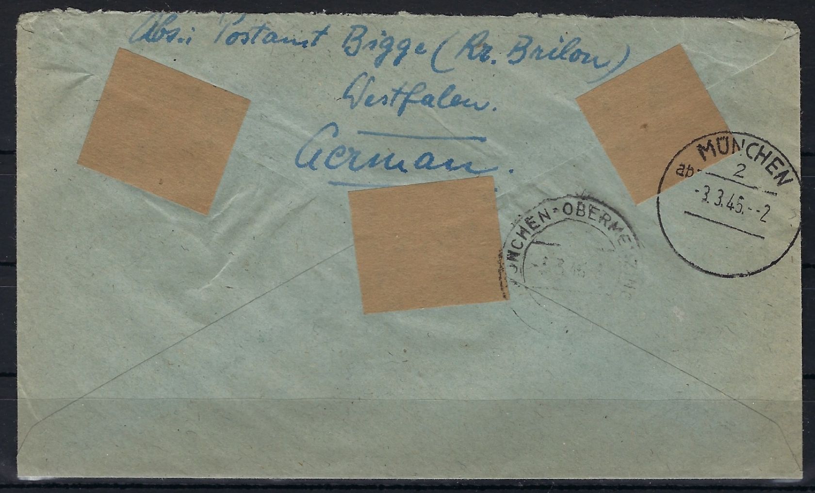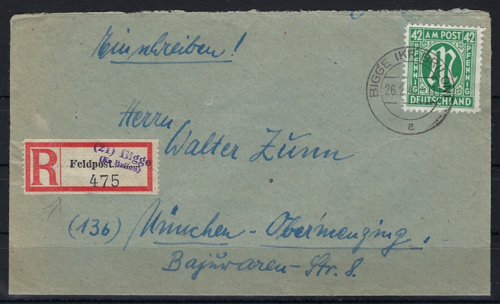 AM Post Mi 31 EF Einschreiben mit Notverwendung eines alten Feldpost-Zettel des 3. Reiches, befördert von Bigge n. München 1946