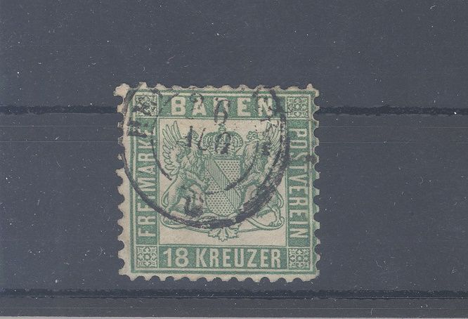 Baden Michel Nummer 21, 18 Kreuzer Freimarken 1862 gestempelt mit Mängeln. Der Wert ist geprüft BPP, billigst.