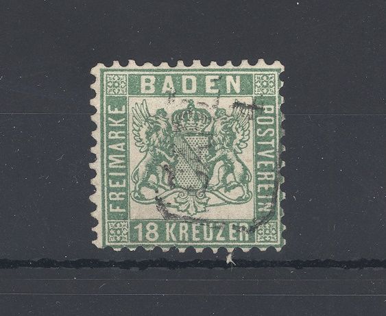 Baden Michel Nummer 21, 18 Kreuzer Freimarke 1862 gestempelt.
