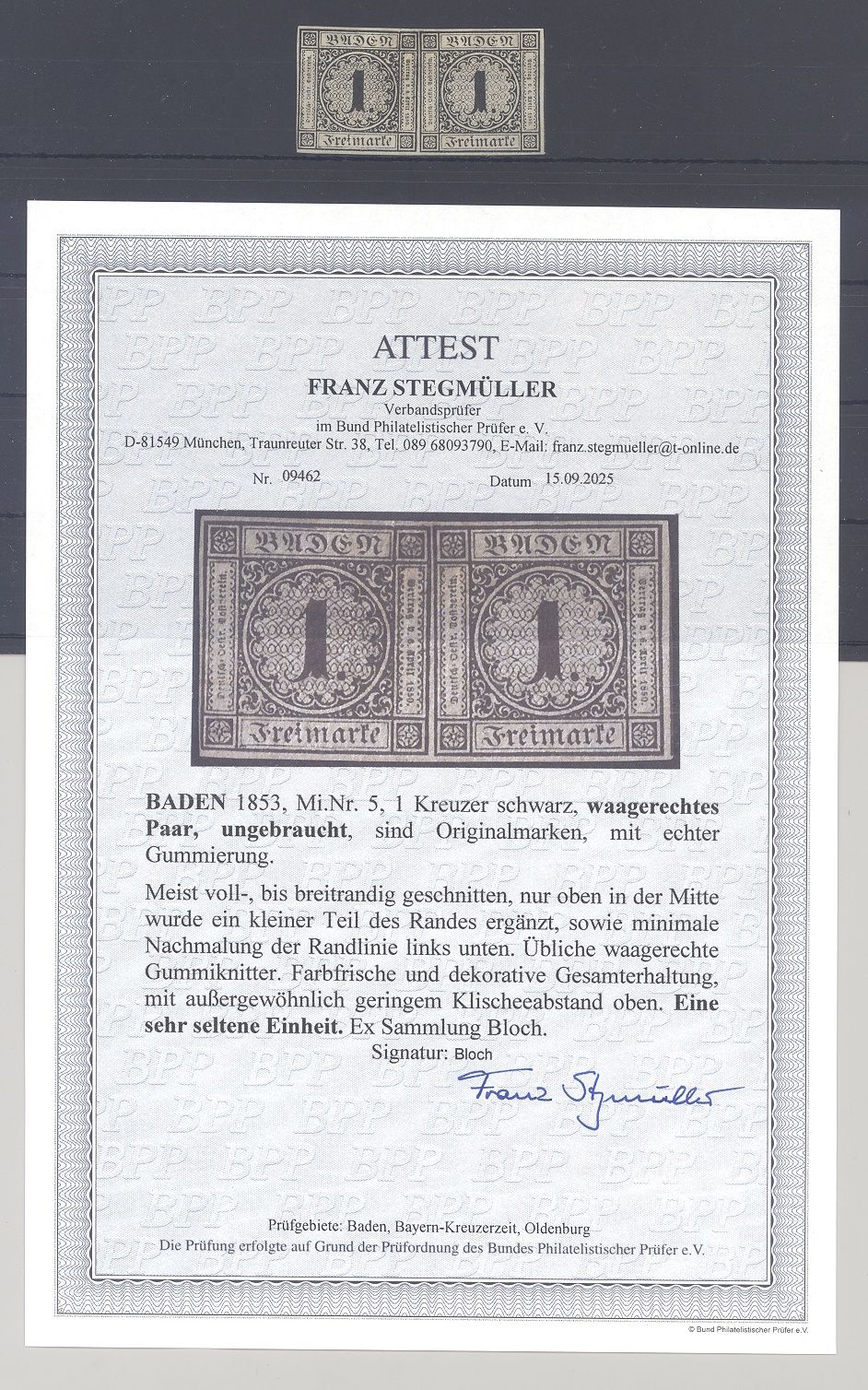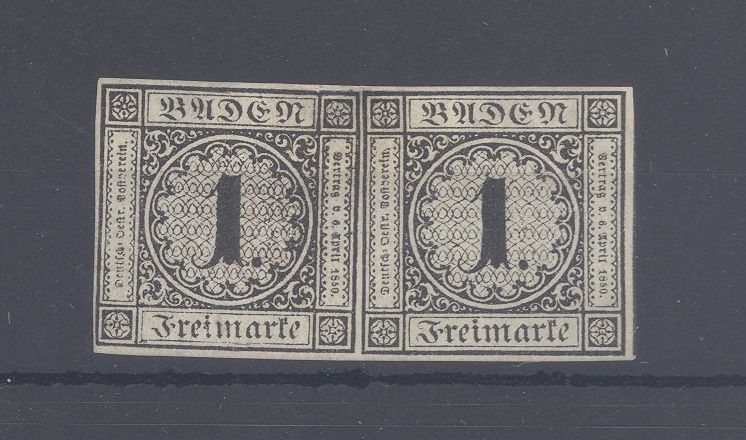 Baden Michel Nummer 5, 1 Kreuzer Freimarke 1853 als ungebrauchtes * Paar, etwas ausgebessert, optisch eine schöne Einheit. Es liegt ein FA BPP vor, hat bereits einiges gekostet, wie im FA auch angegeben eine echte Altdeutschland Seltenheit!