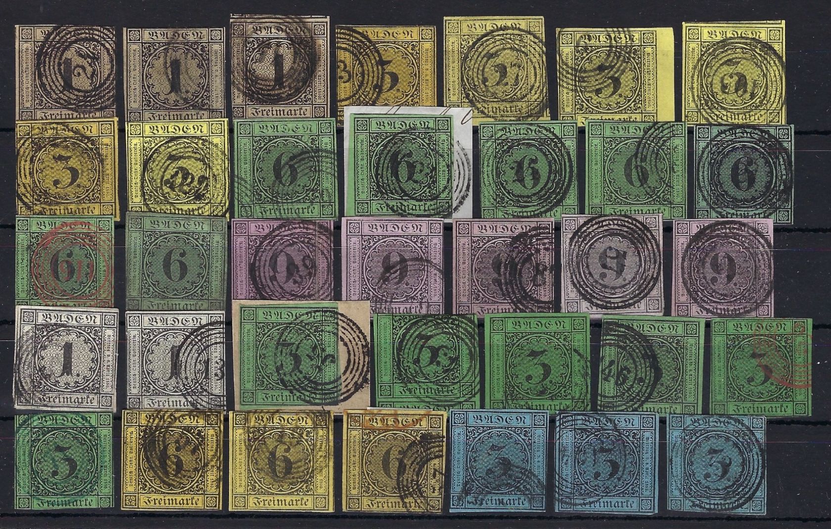 Umfangreiche gestempelte Partie aus Mi. 1–8, mehrfach vorhanden, mit einer Vielfalt an Nummernstempeln, teilweise mit zentrischer Entwertung