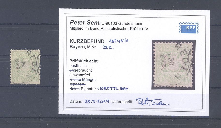 Bayern Michel Nummer 32c, 1 Kreuzer Wappen 1875 in der Farbe c gestempelt, ein schöner Wert. Es liegt ein Befund BPP Vor, ist mit eingescannt, hat bereits einiges gekostet.