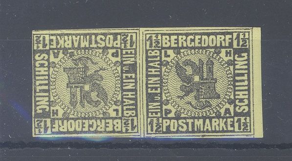 Bergedorf Michel Nummer 3 K , 1 /2 S. als ungebrauchtes Kehrdruckpaar *. Das Paar ist signiert.