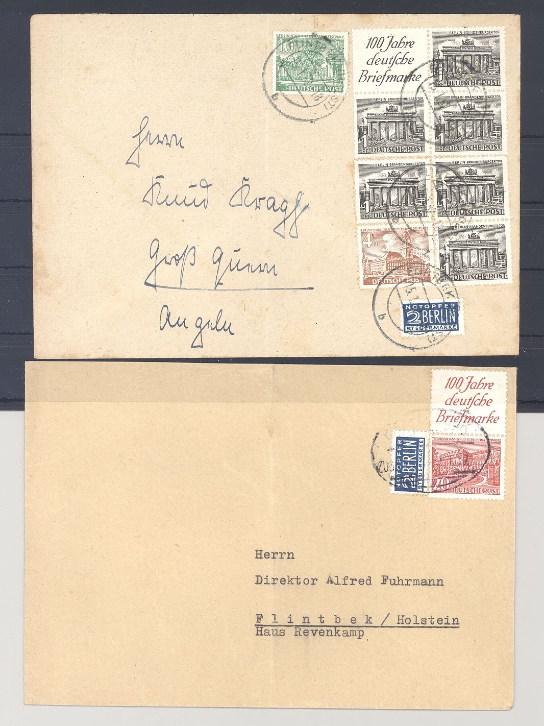 Berlin, zwei Briefe mit Zusammendrucken aus Bauten 1949 als Posten. Es sind die Michel Nummern W1 und S4 vorhanden, nette Ergänzung zur Sammlung!