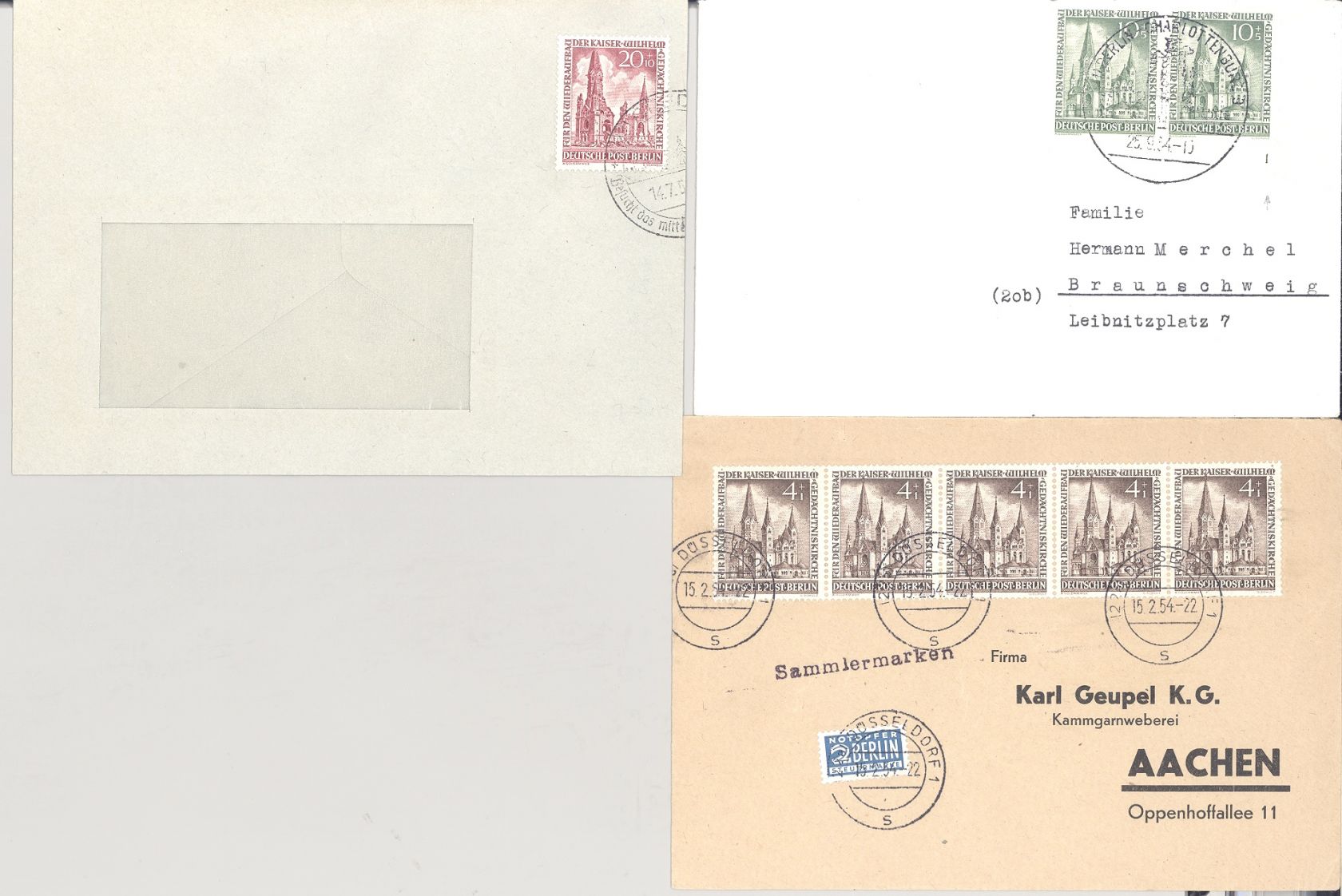 Berlin, drei Briefe aus Michel Nummer 106/09, Gedächtniskirche 1953 als Posten. Dabei ein Fünferstreifen, die 20 Pfg. als EF und einmal die 10 Pfg. als Paar vom Eckrand mit Formnummer. Nett!