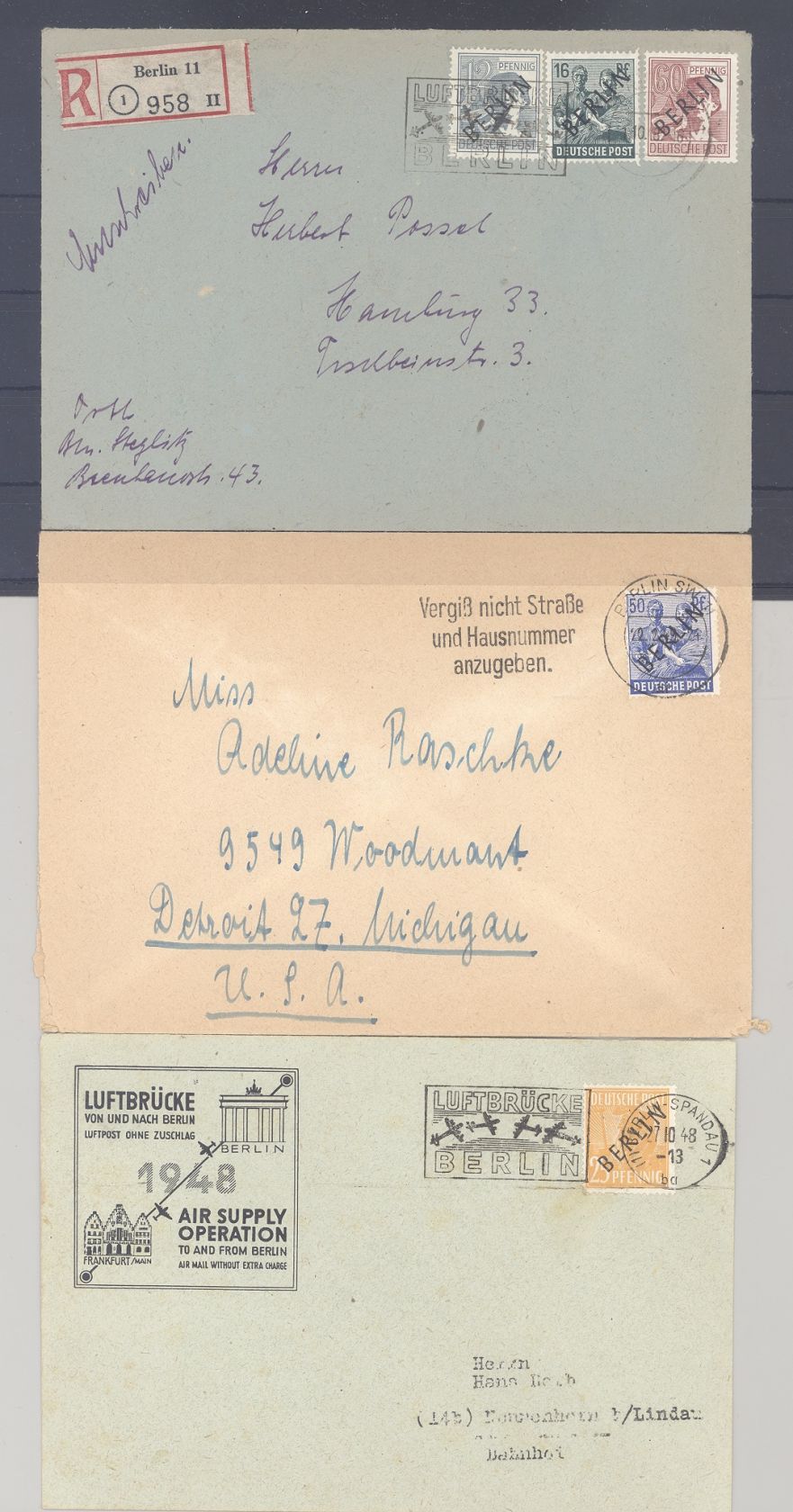 Berlin, drei interessante Briefe mit Schwarzaufdrucken als Posten, dabei eine schöne MiF, eine 25 Pfg. als EF, ein Luftbrücken Brief und ein Brief mit 50 Pfg. EF in die USA. Nett!