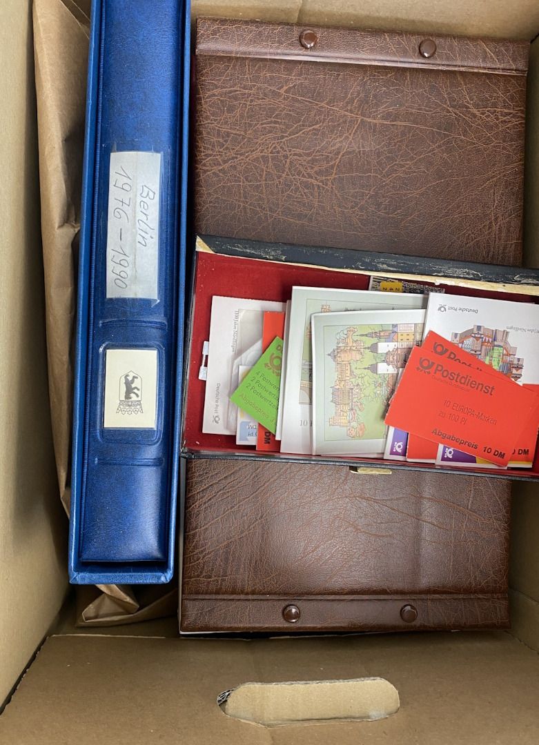 Berlin, Karton mit umfangreichen Bestand, dabei eine Sammlung 1976/90 im Vordruckalbum, diverse Alben mit ETB und auch Markenheftchen. Vollkommen unberechnet, sollte bereits aufgrund der Materialfülle sicherlich ein nettes Schnäppchen sein