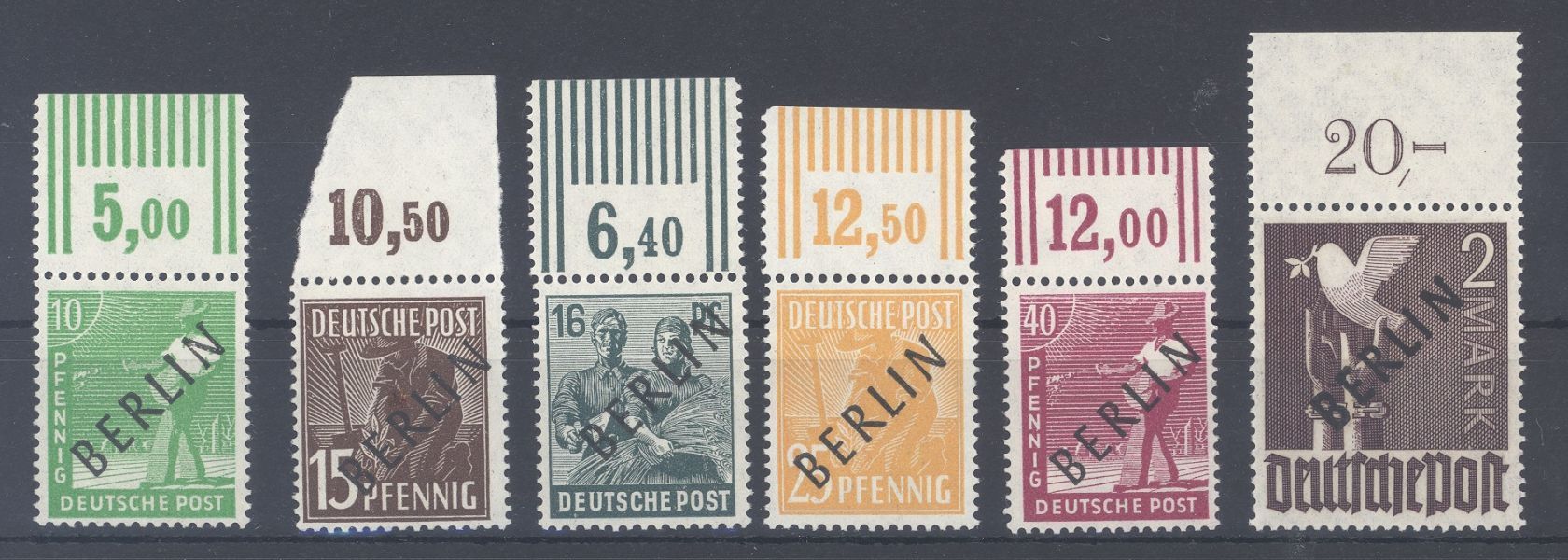 Berlin, kleiner ** Posten Oberrandwerte aus Michel Nummer 1/17, Schwarzaufdruck 1948 bestehend aus Michel Nummer 4, 6, 7, 10, 12 und 18. Stets billigste Varianten gerechnet, zwei Werte incl. der 2 Mark haben einen ungefalteten Oberrand.
