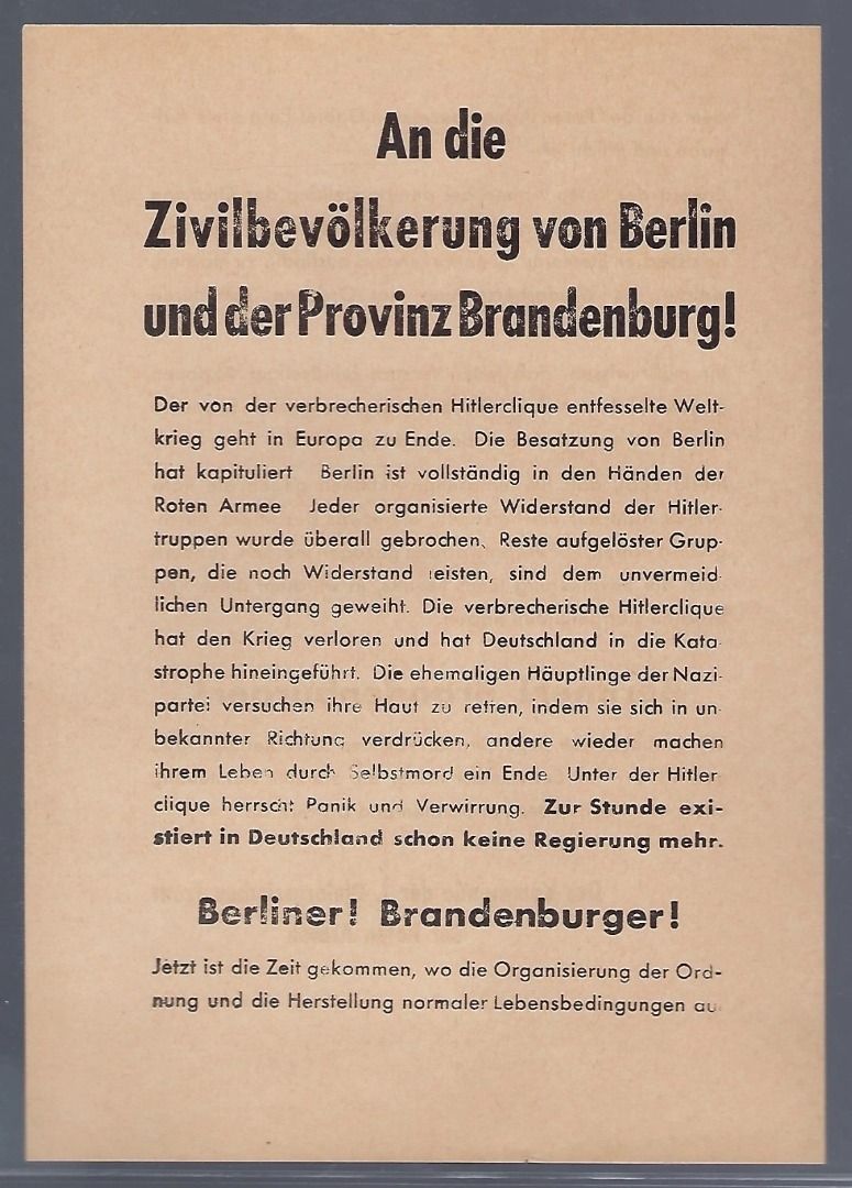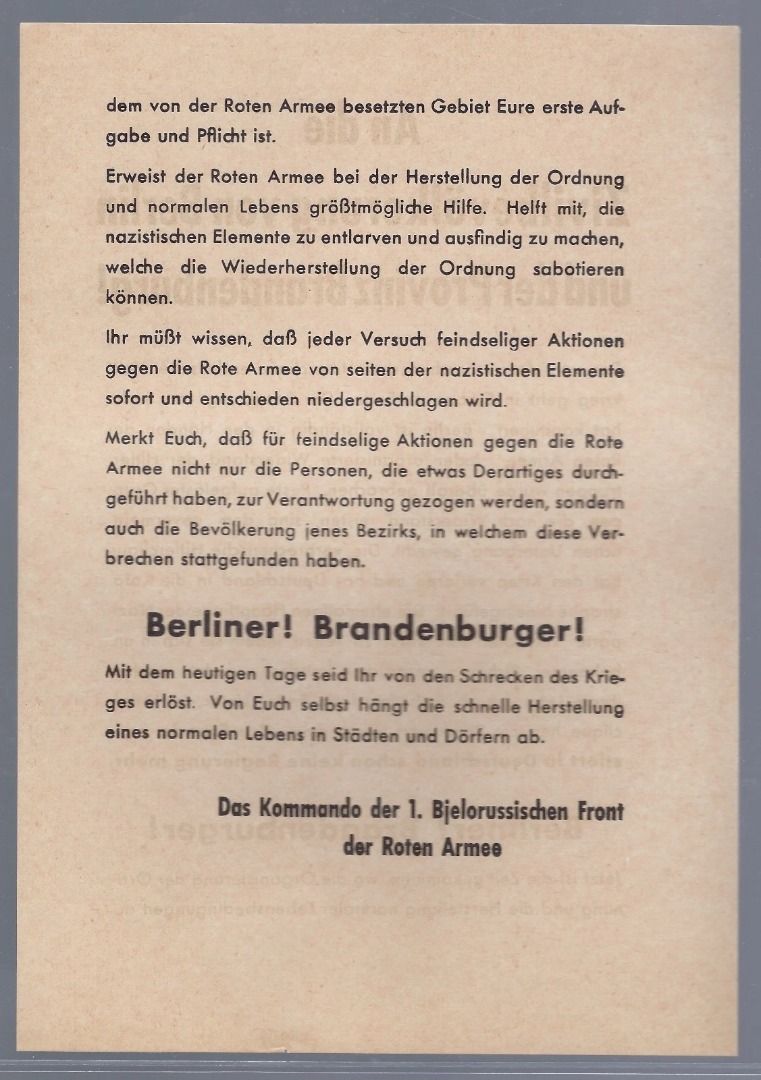 Berlin Kriegsende, Infoblatt der Roten Armee an die Bevölkerung. Selten