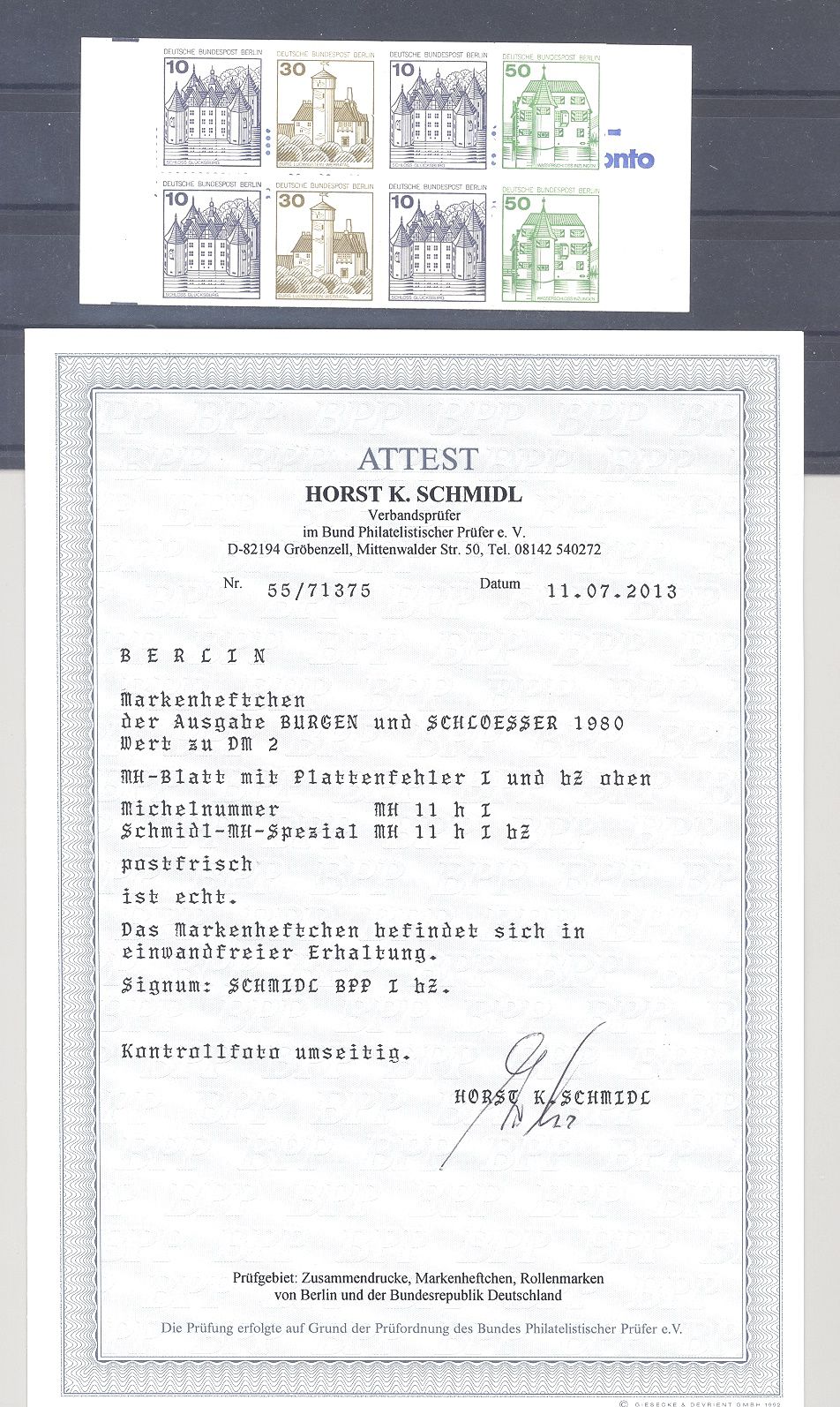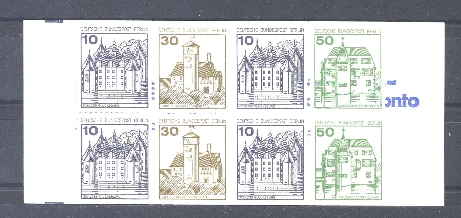 Berlin Markenheftchen MH 11 h I, Burgen & Schlösser mit dem sehr seltenen Plattenfehler I ** in guter Erhaltung. Es liegt ein FA Schmidl BBP vor, hat bereits einiges gekostet, ist mit eingescannt.