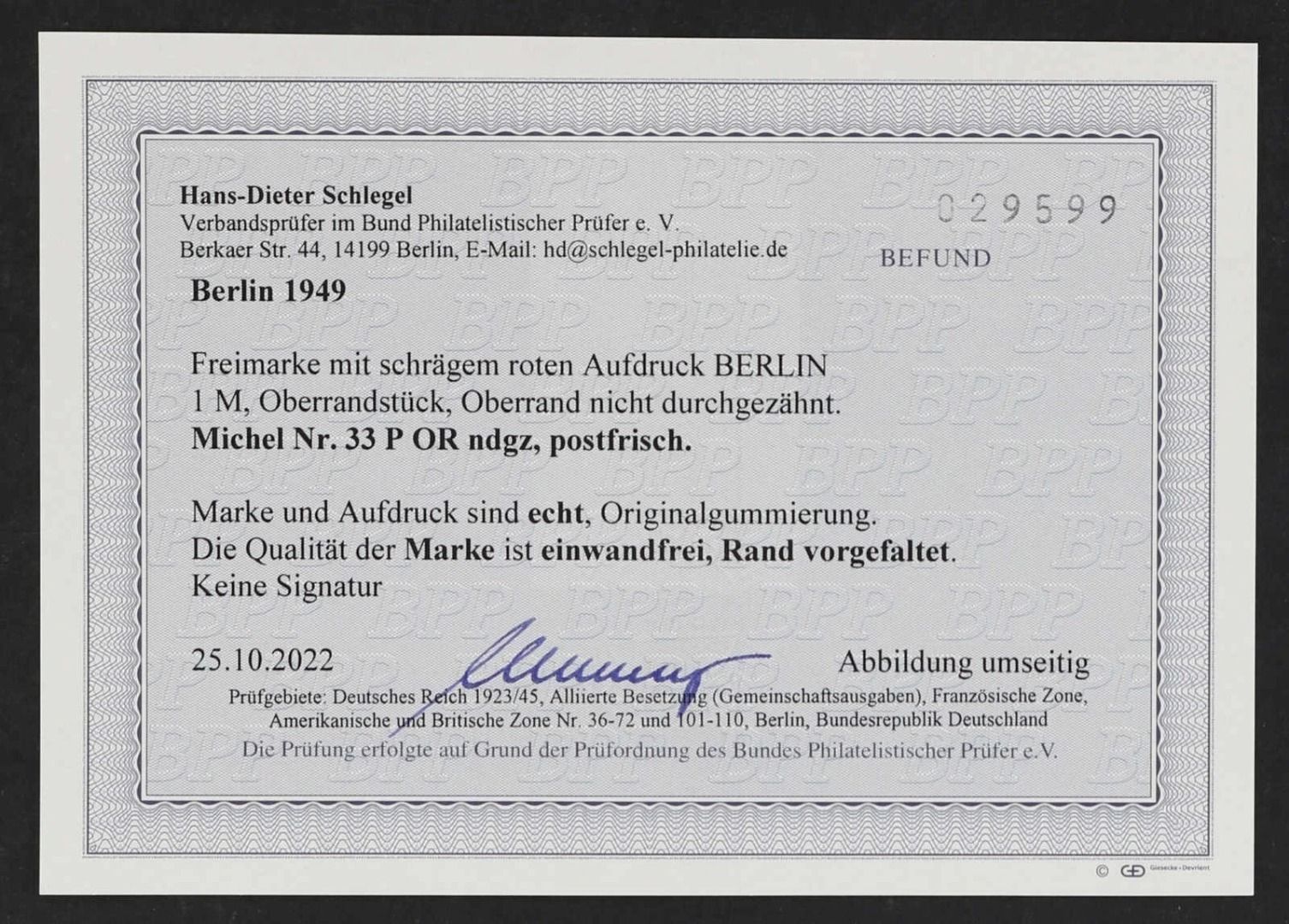 Berlin mi 33 P OR** einwandfrei (Rand vorgefaltet) Befund Schlegel BPP