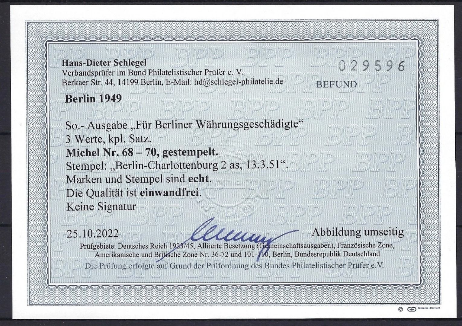 Berlin Mi 68-70 ideal gestempelt Berlin-Charlottenburg, Befund Schlegel BPP