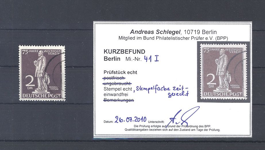 Berlin Michel Nummer 41 I, 2 DM Weltpostverein 1949 mit dem Plattenfehler I gestempelt, ein ordentlicher Wert. Es liegt ein Kurzbefund BPP vor, ist mit eingescannt.