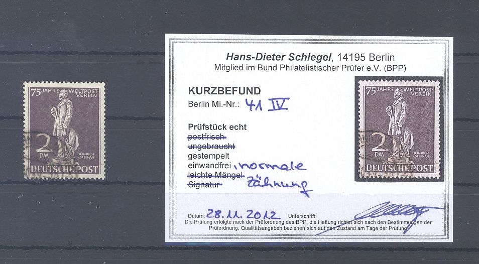 Berlin Michel Nummer 41 IV, 2 Mark UPU 1949 mit der Abart IV gestempelt. Es liegt ein Befund BPP vor, ist mit eingescannt, hat bereits einiges gekostet.
