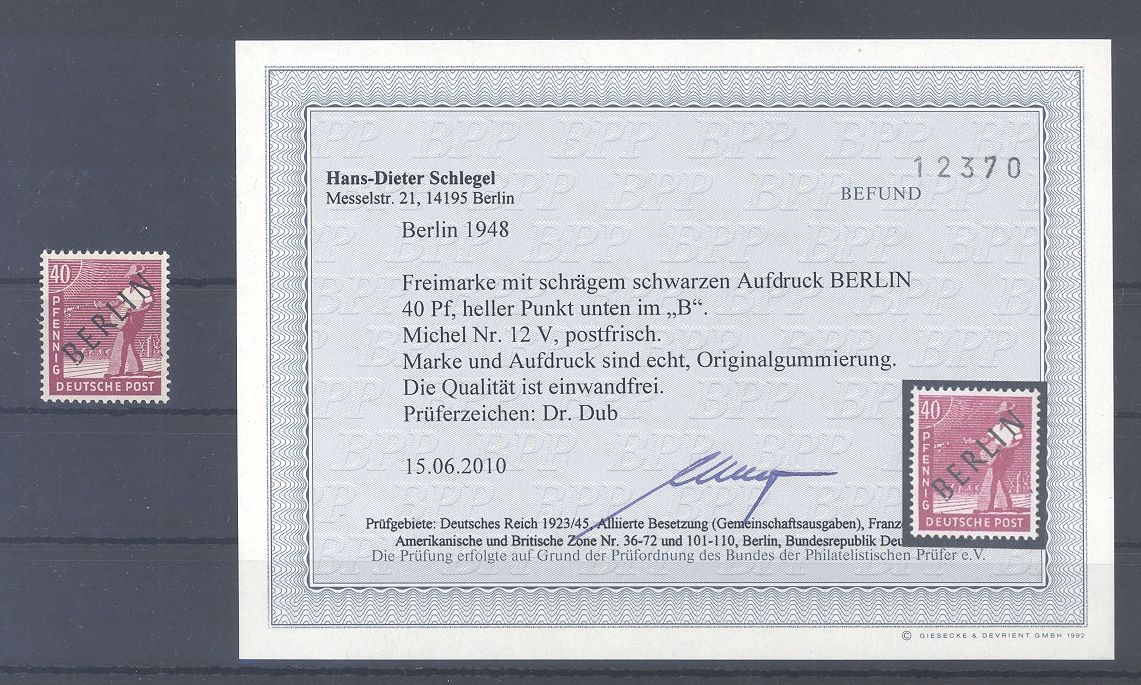 Berlin Michel Nummer 12 AF V, die 40 Pfg. Schwarzaufdruck Freimarke 1949 mit dem Aufdruckfehler V **, ein schöner Wert. Es liegt ein Befund BPP vor, ist mit eingescannt, hat bereits einiges gekostet.
