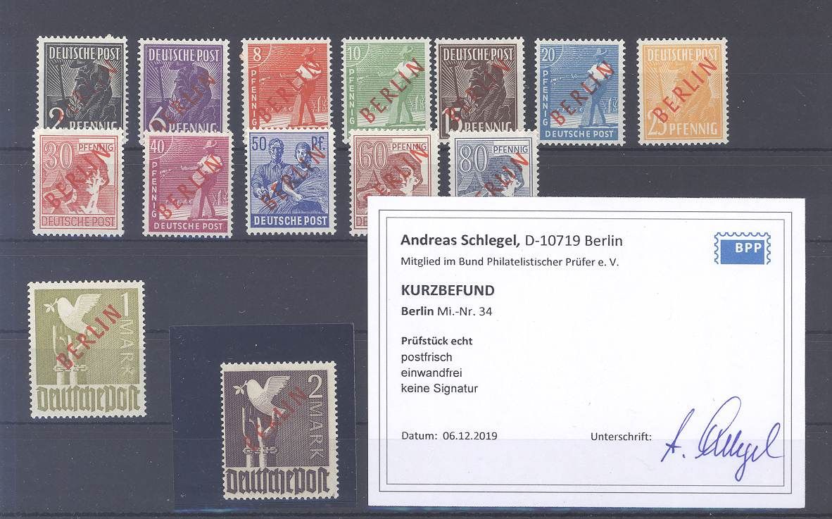 Berlin Mi.Nr. 21/34 Rotaufdruck 1949 **. Jeder Wert ist geprüft BPP, für die Mi.Nr. 34 liegt sogar ein Befund BPP vor, ist mit eingescannt.