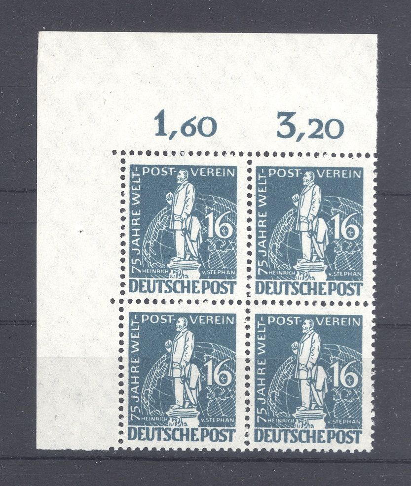 Berlin Michel Nummer 36, 16 Pfg. Weltpostverein UPU 1949 im ** Viererblock, dieser an den Rändern etwas bügig. Nette Ergänzung zur Sammlung.