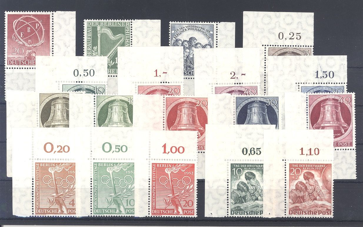 Berlin, ** Posten guter Eckrandwerte und Sätze aus 1950/52 bestehend aus Michel Nummer 71/73, 75/79, 80/81 und 82/86 auf Steckkarte. Nett!