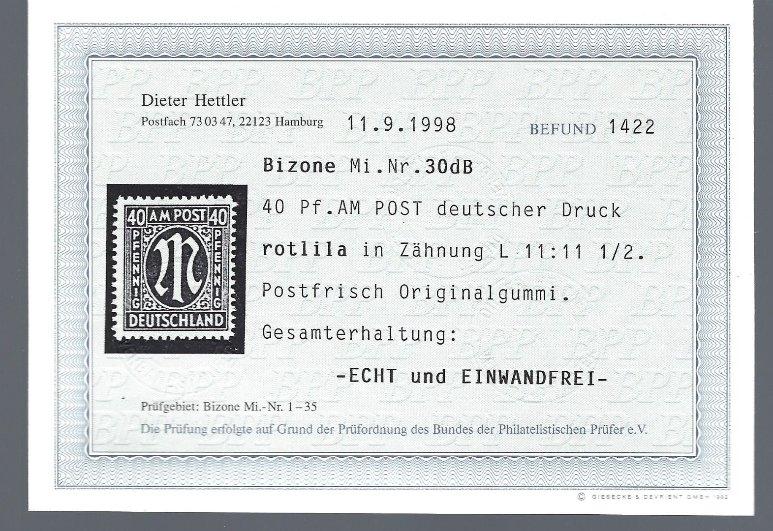 Bizone / AM Post Mi 30 d B ** einwandfrei mit Befund BPP