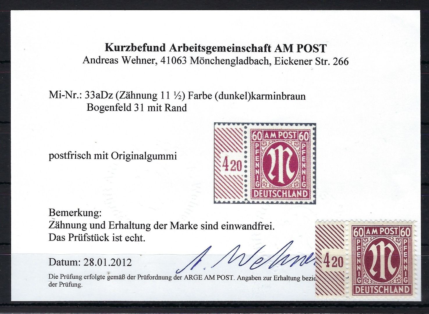 Bizone / AM Post Mi 33 a D z ** einwandfrei, mit KB Wehner ArGe AM Post