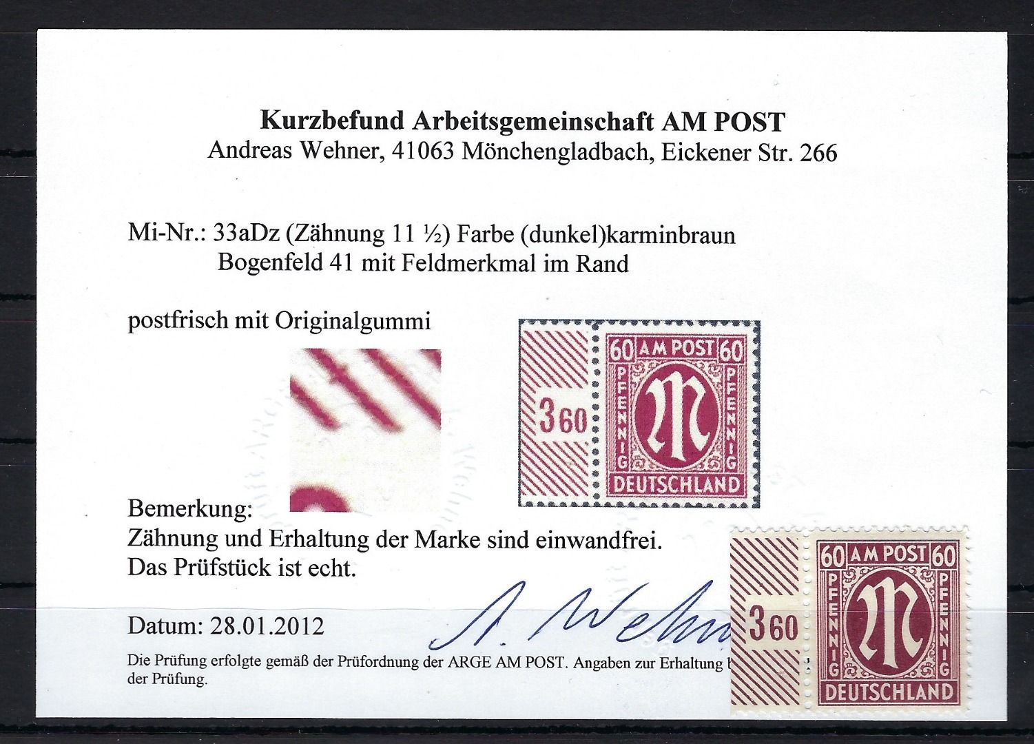 Bizone / AM Post Mi 33 a D z ** einwandfrei, mit KB Wehner ArGe AM Post