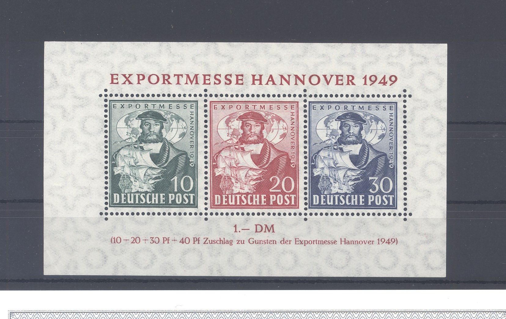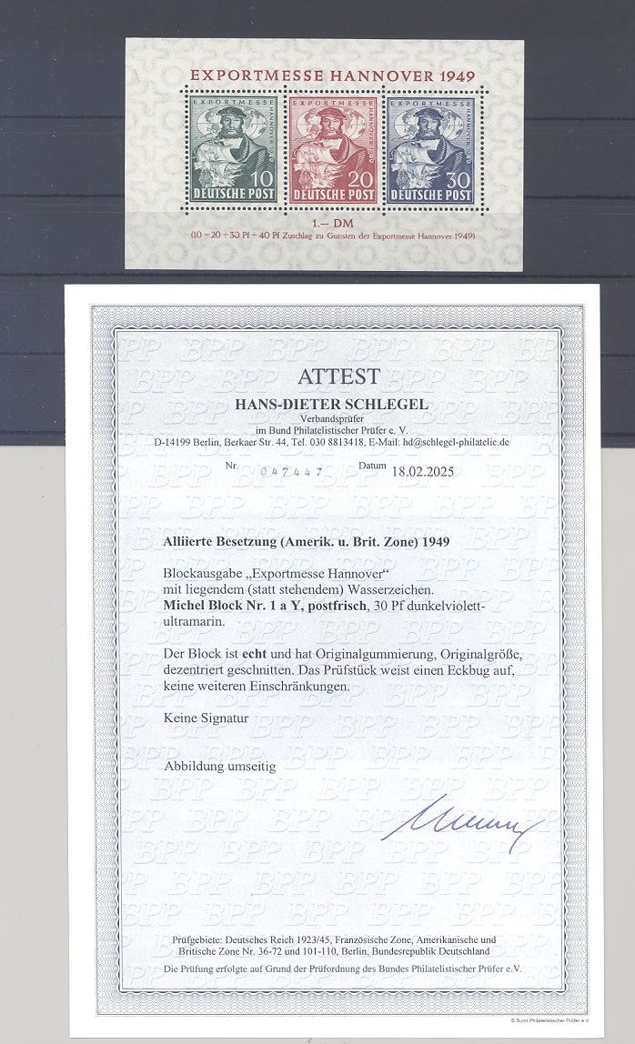 Bizone Block 1 Y, Exportmesse 1949 mit dem seltenen Wasserzeichen Y ** mit einem Eckbug, sonst ein schöner Wert. Es liegt ein FA BPP vor, hat bereits einiges gekostet, ist mit eingescannt.