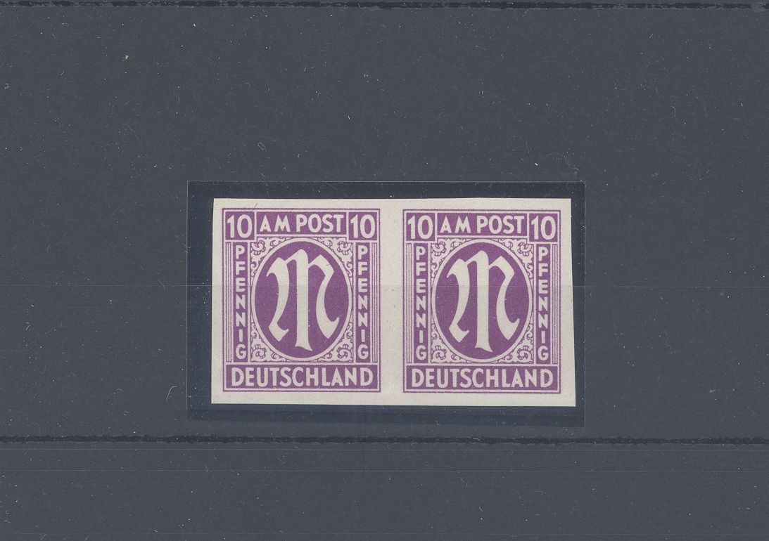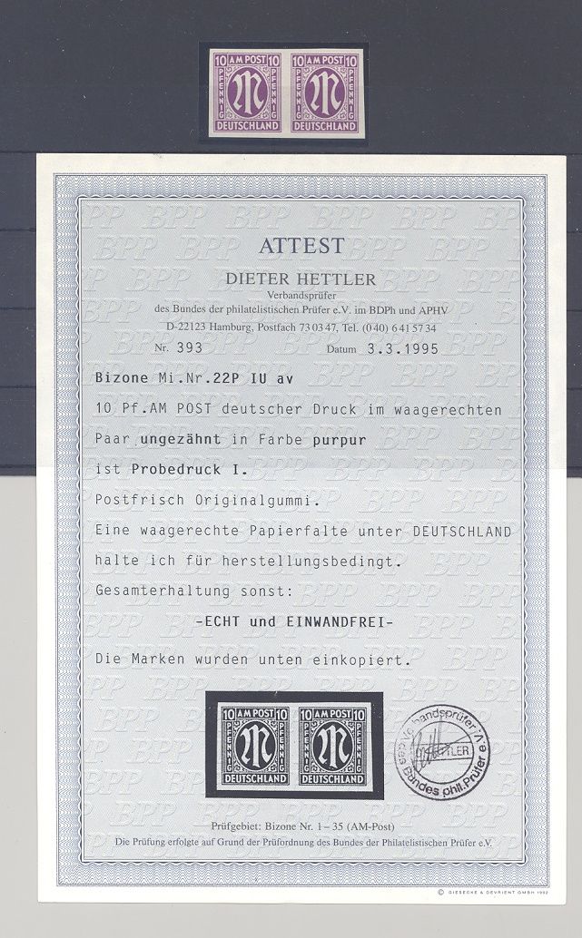 Bizone Michel Nummer 22 P, die 10 Pfg. AM Post Freimarkel Probedruck als ** Paar mit einer herstellungsbedingten Papierfalte, sonst ein schönes Paar. Es liegt ein FA BPP vor, hat bereits einiges gekostet, ist mit eingescannt, Seltenheit!
