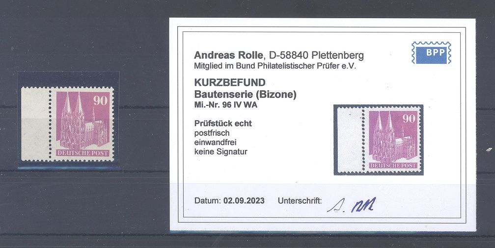 Bizone Michel Nummer 96 IV WA, 90 Pfg. Bauten enge Zähnung **. Es liegt ein Befund BPP vor, hat bereits einiges gekostet, ist mit eingescannt.