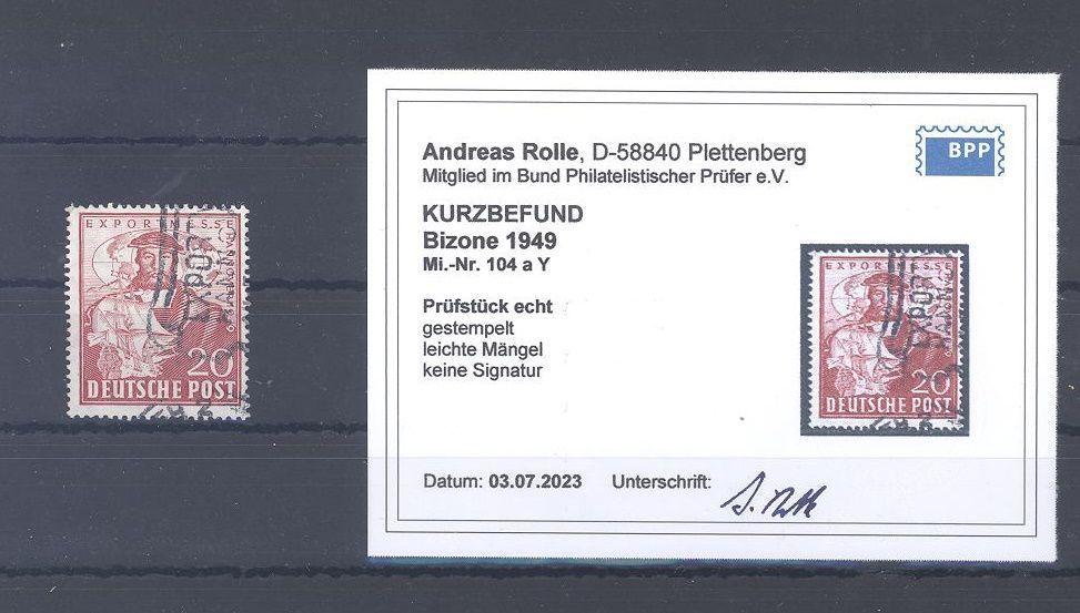 Bizone Michel Nummer 104y, Exportmesse 1949 gestempelt in der seltenen Variante y, in ordentlicher Bedarfserhaltung. Es liegt ein Befund BPP vor, ist mit eingescannt, hat bereits einiges gekostet. Es gibt keinen Michel für gestempelt, nur für ** und die ** Marke wertet bereits mit 400,00 Euro.