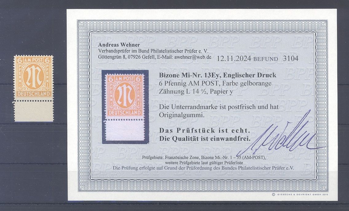 Bizone Michel Nummer 13 Ey, 6 Pfg. AM Post 1945 in der guten Variante Ey ** als Randwert. Es liegt ein Befund BPP vor, hat bereits einiges gekostet, ist mit eingescannt.