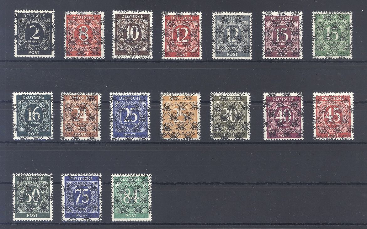 Bizone Michel Nummer 52/68 II, Ziffern Netzaufdrucke **, jeder Wert hat eine kleine Signatur rückseitig.