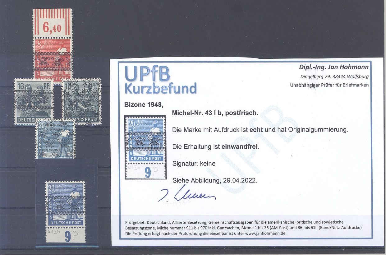 Bizone, ** Posten Farben aus Michel Nummer 36/51, Währungsreform 1948, ein Wert vom Oberrand. Jeder Wert ist signiert ArGe Hohmann und es liegt zudem auch ein Befund vor, ist mit eingescannt.