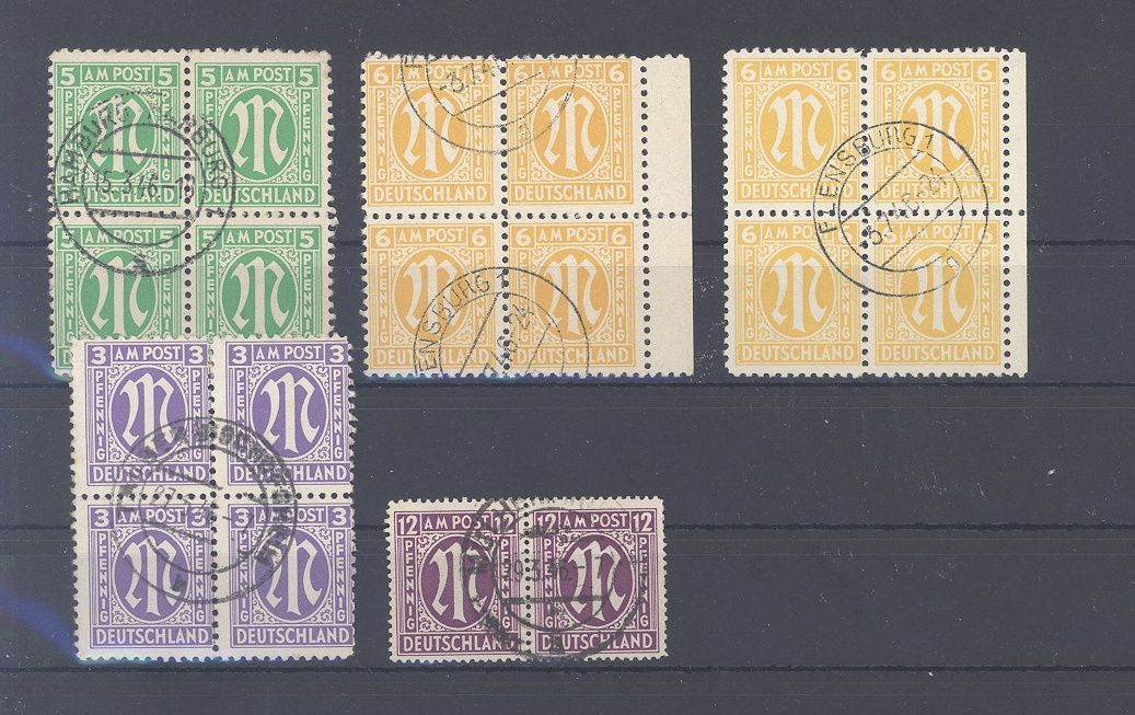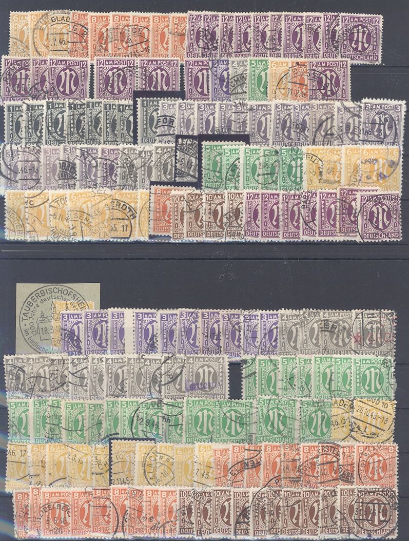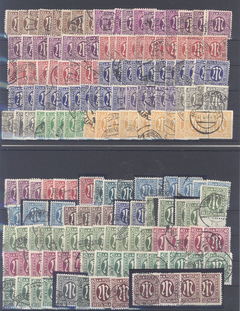 Bizone, umfangreicher gestempelter Posten AM Post auf fünf Steckkarten, einfach zusammengesteckt. Vollkommen unberechnet, könnte auch eine schöne Fundgrube hinsichtlich Farben, Typen, PLattenfehlern,... sein...