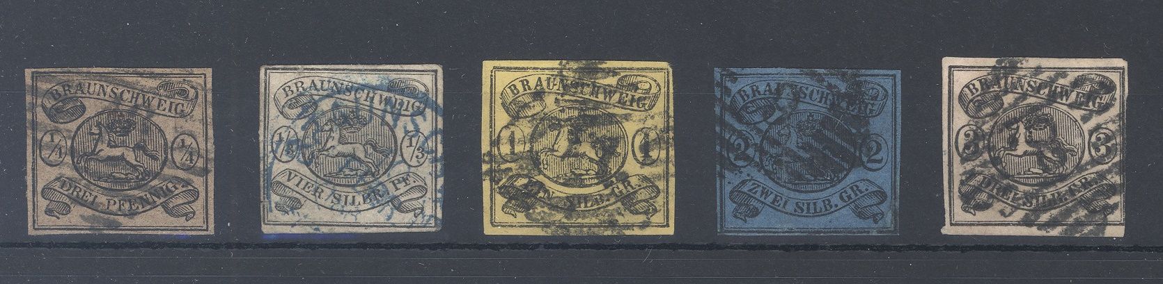 Braunschweig Michel Nummer 4/8, Freimarken 1853 gestempelt in etwas unterschiedlicher, insgesamt ordentlicher Erhaltung. Stets billigste Farben gerechnet.