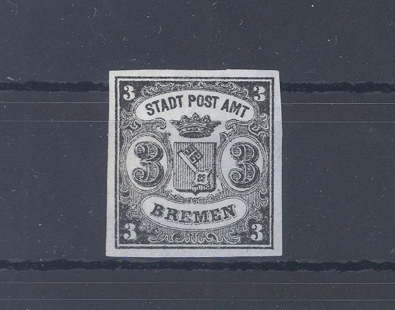 Bremen Michel Nummer 1x, 3 Grote Freimarke 1855 ungebraucht (*) mit einer hellen Stelle unten, sonst ein ordentlicher und vollrandiger Wert.