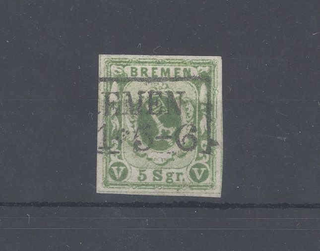 Bremen Michel Nummer 4, 5 Sgr. Freimarke 1859 gestempelt, wohl hinterlegt, ein vollrandiger Wert.