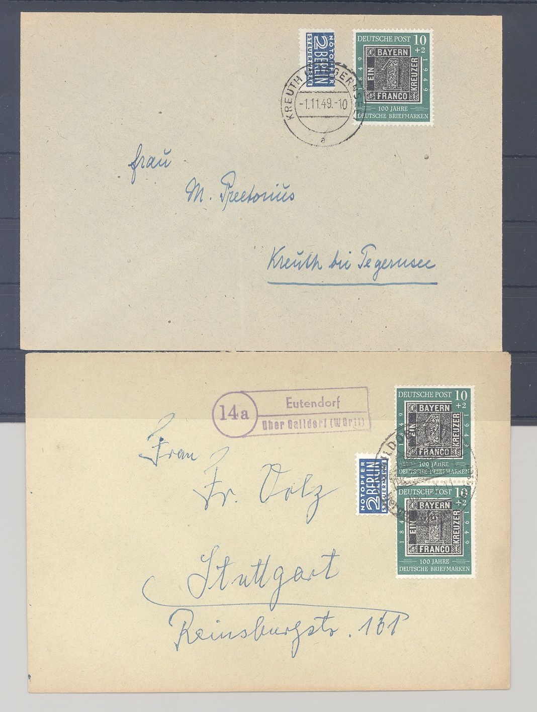 Bund, zwei Briefe mit Michel Nummer 113, 10 Pfg. 100 Jahre Deutsche Briefmarken 1949 als EF und MeF, dabei auch Landpost. Nette Ergänzung zur Sammlung!