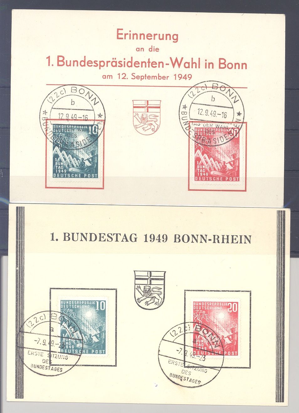 Bund, dekorativer Brief frankiert mit Michel Nummer 111/12, Bundestag 1949 mit zwei verschiedenen schönen SST, einmal FDC, wertet bereits mit 150,00 Euro.