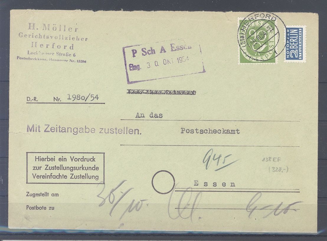 Bund, sauberer Brief portogerecht frankiert 90 Pfg. Posthorn als EF auf Zustellungsurkunde aus Herford.