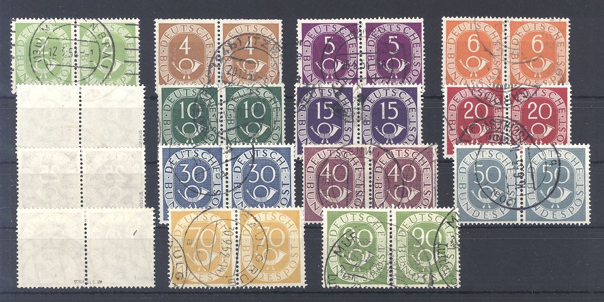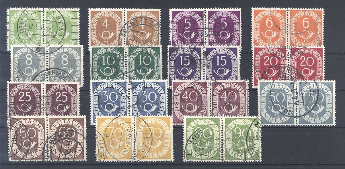 Bund, umfangreicher gestempelter Posten Bund Posthorn Paare in der üblichen Bedarfserhaltung auf Steckkarte, es fehlt nur die 80 Pfg. Freimarke. Drei Paare sind geprüft BPP.