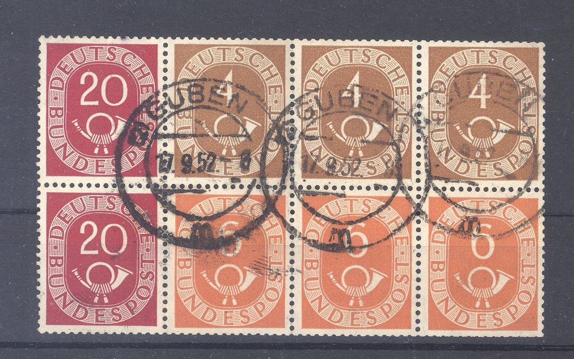 Bund Markenheftchenblatt Posthorn 2 weitgehend komplett gestempelt, es fehlt die erste linke Reihe und der linke Rand. Das komplette Markenheftchenblatt wertet mit 1.700,00 Euro.