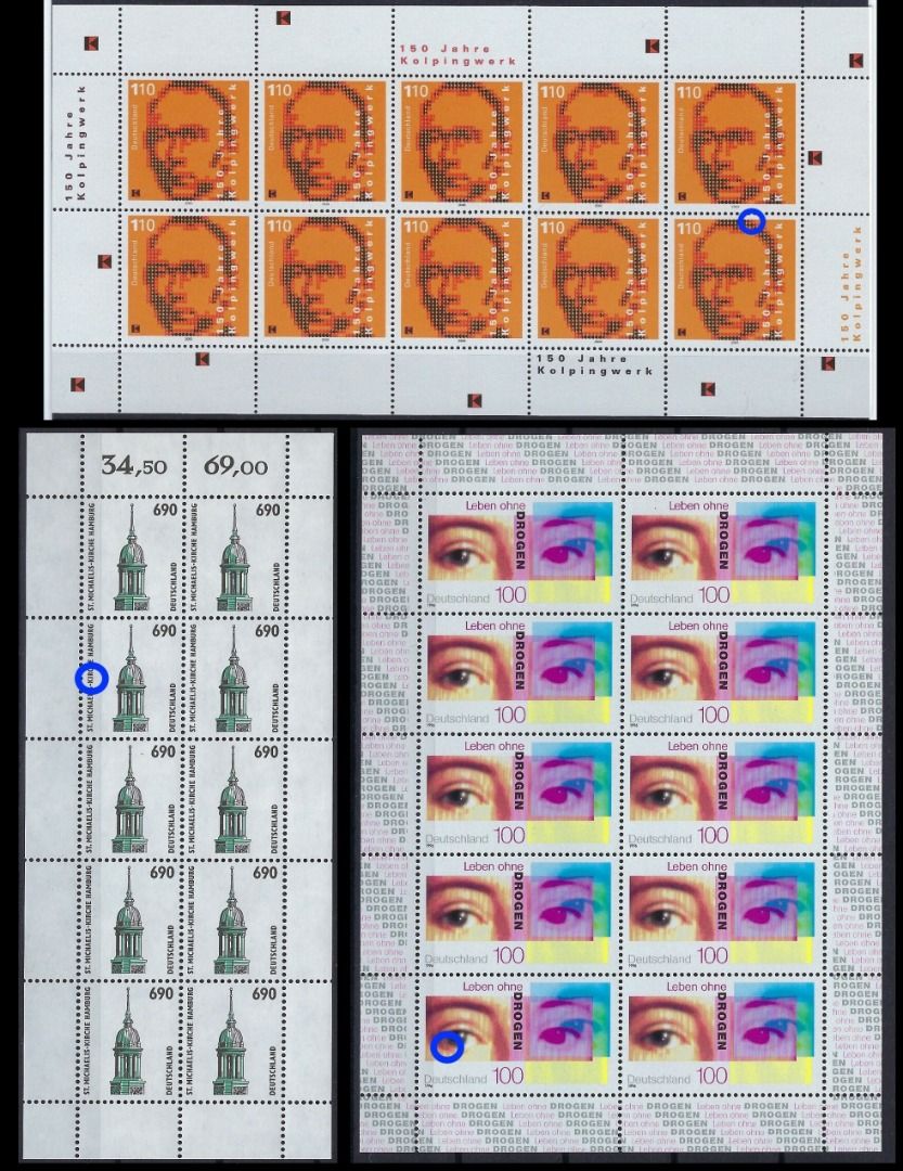Bund Mi 1860, 1882, 2135 jeweils im 10er-Bogen mit Plattenfehler I, Mi 1882 und 2135 ohne Preis _._, einwandfreie Qualität