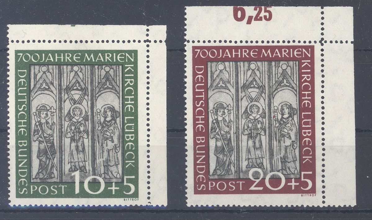 Bund Michel Nummer 139/40, Marienkirche 1951 ** als Eckrandsatz mit beschnittenem Eckrand. Nette Ergänzung zur Sammlung.