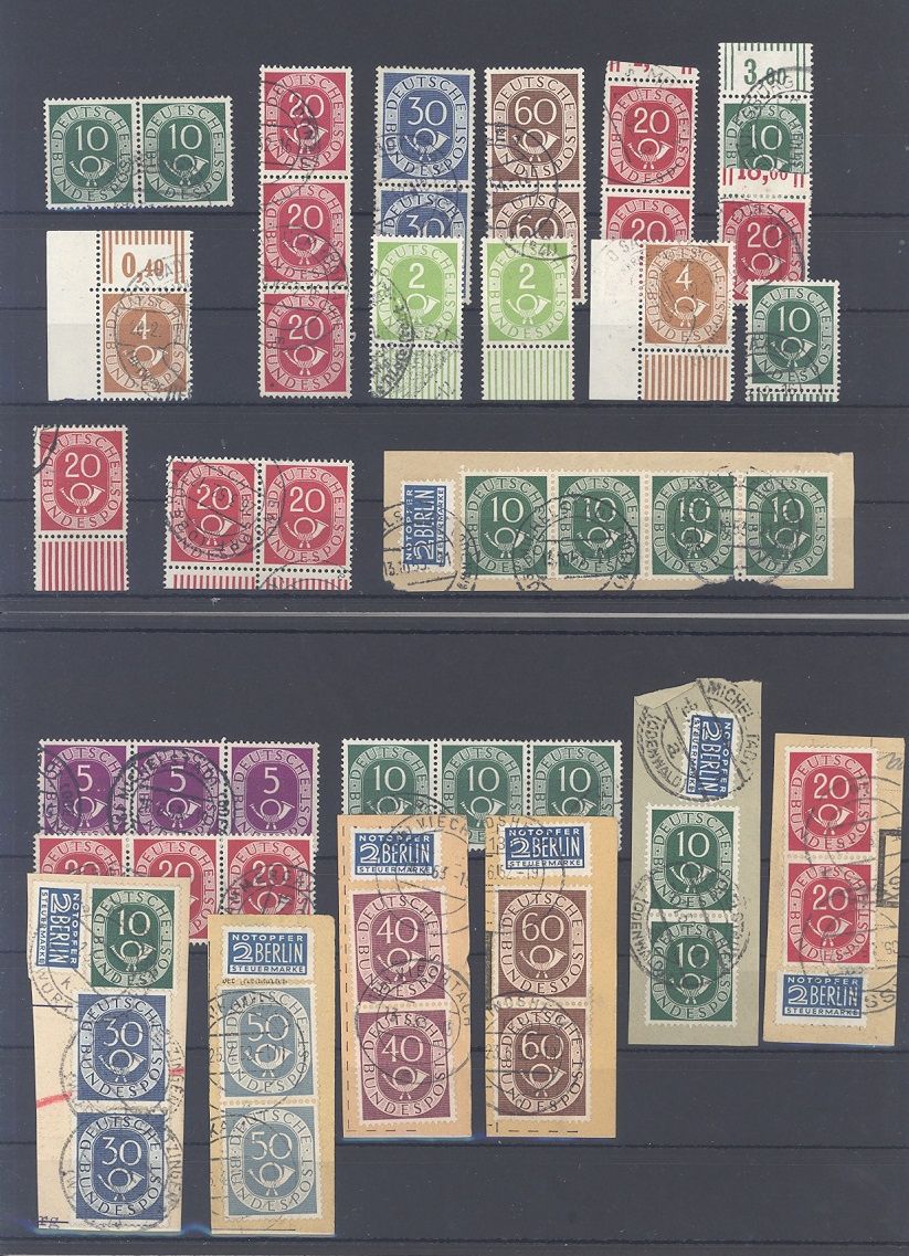 Bund, interessanter und umfangreicher gestempelter Posten Posthorn Einheiten und Randwerte auf zwei Steckkarten, einfach zusammengesteckt mit auch vielen Briefstücken. Nette Ergänzung zur Sammlung!