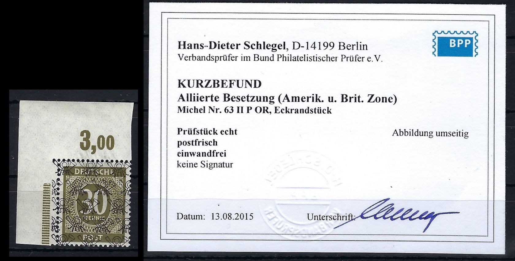 C) Bizone Mi 63 II P OR ** Bogenecke, einwandfrei, KB Schlegel BPP