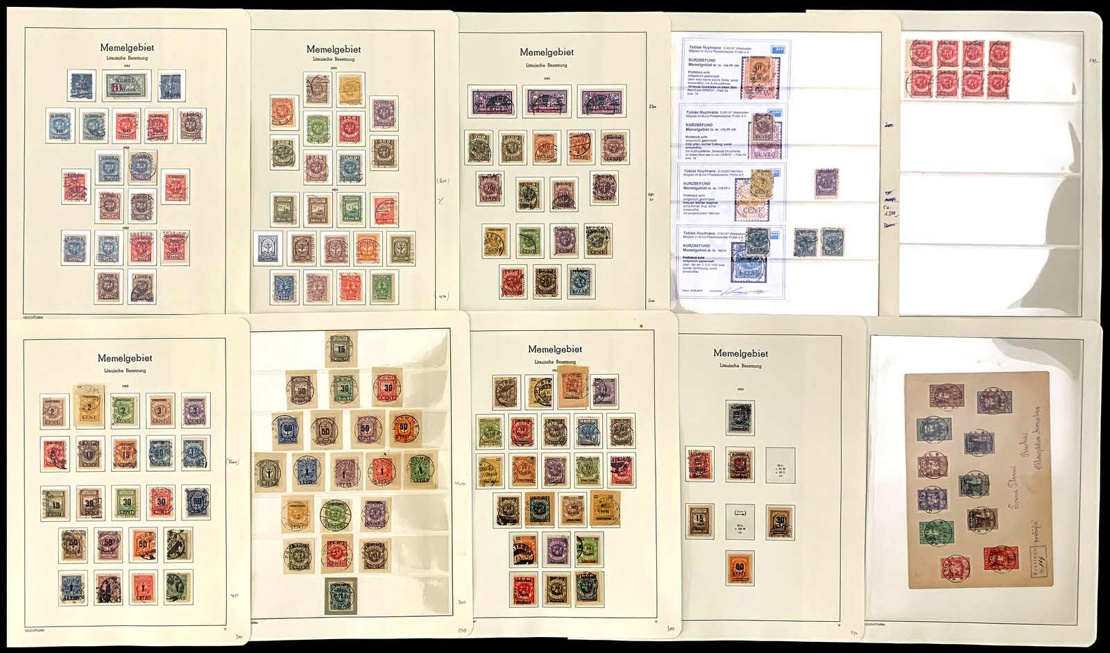 Memelgebiet 1923: gestempelte Sammlung auf losen Blättern. Nur wenige Ausgaben sind geprüft, darunter auch einige Plattenfehler, mit 4 Kurzbefunden von Huylmans BPP sowie senkrechten Mischtypen, geprüft von Dr. Petersen BPP, usw. Michel ca. 16.000 €. Die Sammlung ist vollständig abgebildet.