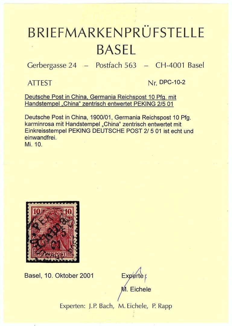 10 Pf. Freimarke (Handstempelaufdruck) 1900, sauber entwertet ,,PEKING DEUTSCHE Post 2/5 01". Fotoattest Basel, einwandfrei, ME. 1.100,-€